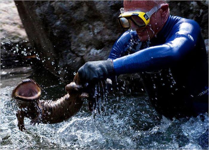 아마존 분홍돌고래에게 먹이를 주는 제레미 웨이드씨